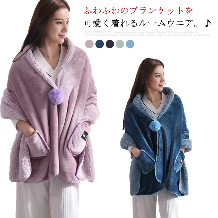 ■ブランケット ポンチョ ポケット付き もこもこ 毛布 ファンネル ストール 裏ボア 膝掛け もうふ 丸洗い ポンポン付き 防寒対策 肩掛け オ