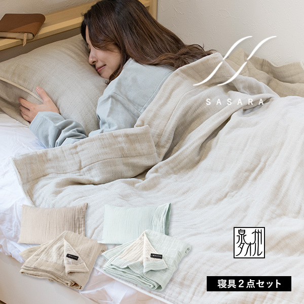 泉州こだわりタオル認定商品、4重ガーゼSASARA(ササラ)日本のタオル産業発祥の地大阪泉州地域で作られた4重ガーゼ生地を使用した、ガーゼケット、ピローカバーがセットになった商品です。肌当たりが優しく、通気性と吸湿性に優れたガーゼ素材で作られているので、汗ばむ夜も快適な睡眠をサポート。環境にも配慮した製法で作り上げたことで、素材本来の柔らかい色合いに。ガーゼの素材感と優しい色合いが、より心地よい睡眠を誘うこだわりの日本製ガーゼ寝です。≪ガーゼケット≫サイズ:約140×190cm重さ:約750g素材:綿100%原産国:日本(大阪・泉州)≪ピローカバー≫サイズ:約41〜43×69cm重さ:約170g素材:綿100%原産国:日本製(大阪・泉州)※ガーゼ時の特性により、洗濯をすると多少収縮する恐れがあります。