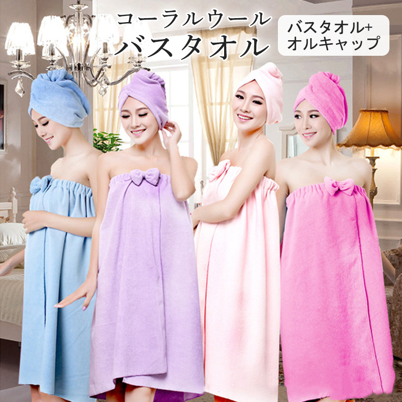 ■ラップタオル レディース 2点 バスローブ バスタオル 着るタオル タオルキャップ タオルケット 吸水 美容室エステ シャワー お