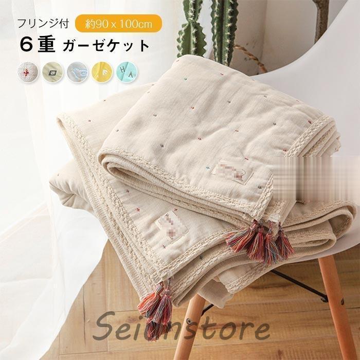 ガーゼケット 綿 6重ガーゼ 肌掛け タオルケット 掛け布団 ベビーケット ブランケットフリンジ付 ひざ掛け ベビーサイズ 90×110cm お昼寝 春夏