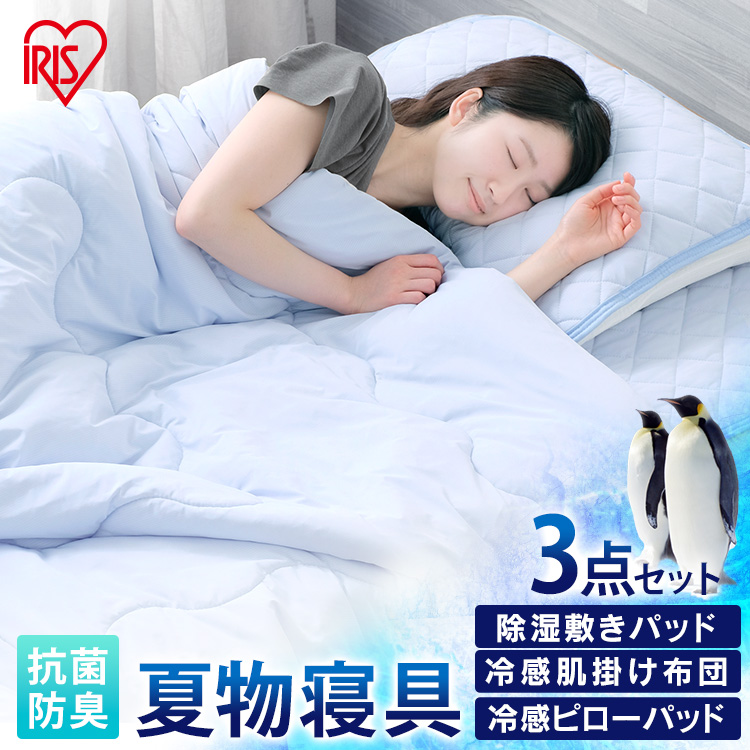 除湿敷きパッド、冷感肌掛け布団、冷感ピローパッドの3点セットです。 ●除湿敷きパッド BSP-JB-S 商品サイズ(cm):幅約100×奥行約205 質量:約1.7kg 目付け(g/m2):【表地】約160【裏地】約140 ●冷感肌掛け布団 HFC-S】 商品サイズ(cm):幅約140×奥行約190 質量:約1.23kg 目付け:約160g/m2 ●冷感ピローパッド PPC-45】 商品サイズ(cm):幅約45×奥行約65 質量:約130g 目付け:約160g/m2 ※洗剤を使用する場合、洗濯ネットを使用し、洗濯力弱め設定でご利用ください。 (アイリスオーヤマ)