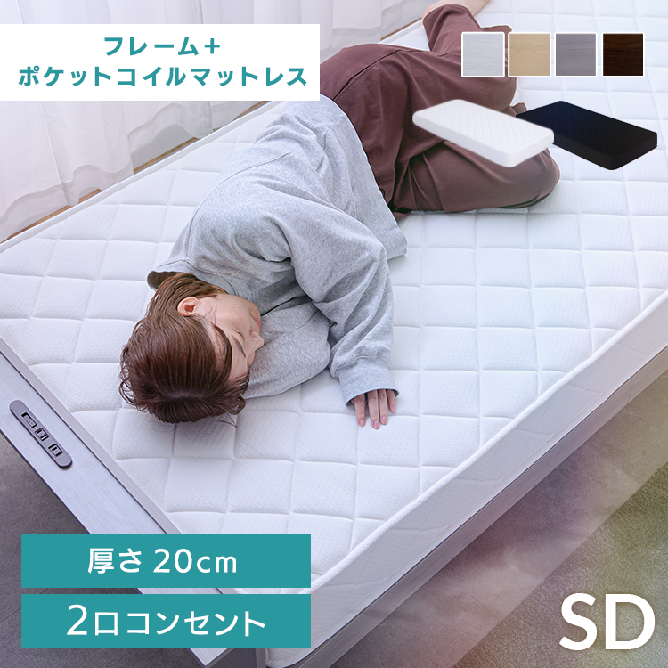 各サイズを専用金具で2台連結すればなんと13通りのサイズ展開!キングサイズはセミシングルを2台連結したサイズになります。このベッドがあればお部屋をベッドで一杯にして家族みんなで寝れちゃいます。■本体寸法/セミシングル:約96,シングル:約105,セミダブル:約125,ダブル:約145×L約210L約210×H約45L約45cm マットレス寸法/セミシングル:約90,シングル:約100,セミダブル:約120,ダブル:約140×L約195L約195×H約17L約17cm MH約19約19cm■本体主材/プリント化粧板、合成皮革、白熱灯(10W)、1口コンセント(1200W)■マットレス:圧縮ロールポケット&ボンネルコイルマットレス付き【16324D】 ■マットレス主材/2.1mmボンネルコイルスプリング(コイル数 SS:240個、S:270個、SD:330個、D:390個)、2.2mmポケットコイルスプリング(コイル数 SS:88個、S:92個、SD:98個、D:104個)、表地:ポリエステル 両面多針キルティング加工、中材:ウレタン/フェルト■生産地/本体:日本、マットレス:日本※キン