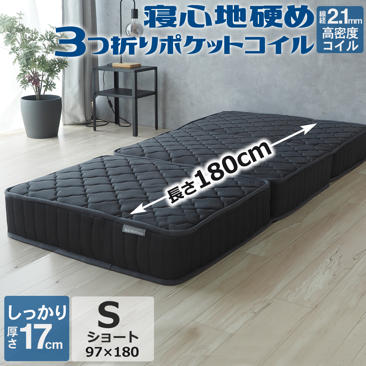 (シングルショート)幅97cm 長さ180cm 厚み17cm 三つ折り時のサイズ:幅97×長さ60×厚み約50cm梱包サイズ:30×30×90cm重さ:約17kgスプリング:バネ数405個 線径2.1mmポケットコイル張り地:ニット生地最終加工地:中国ベッドアンドマットレスTOPへ