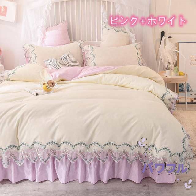 ■【パワフル】布団カバーセット 3点セット セミダブル シングル花レース 姫系 ベッドスカート 寝具カバー 4点セット きれいめ フラットシ