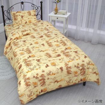 くまのプーさんの布団カバー3点セット。派手すぎないナチュラルテイストなデザインだからお部屋に合わせやすい♪ 生産国:中国 素材・材質:ポリエステル 100% 商品サイズ:ピローケース(合わせ式):43×63cm、掛け布団カバー:150×210cm(ズレ防止ひも6ヶ所付き)、ふとん・ベッド共通用シーツ:100×200×25cm (マチ) 仕様:洗濯機丸洗いOK