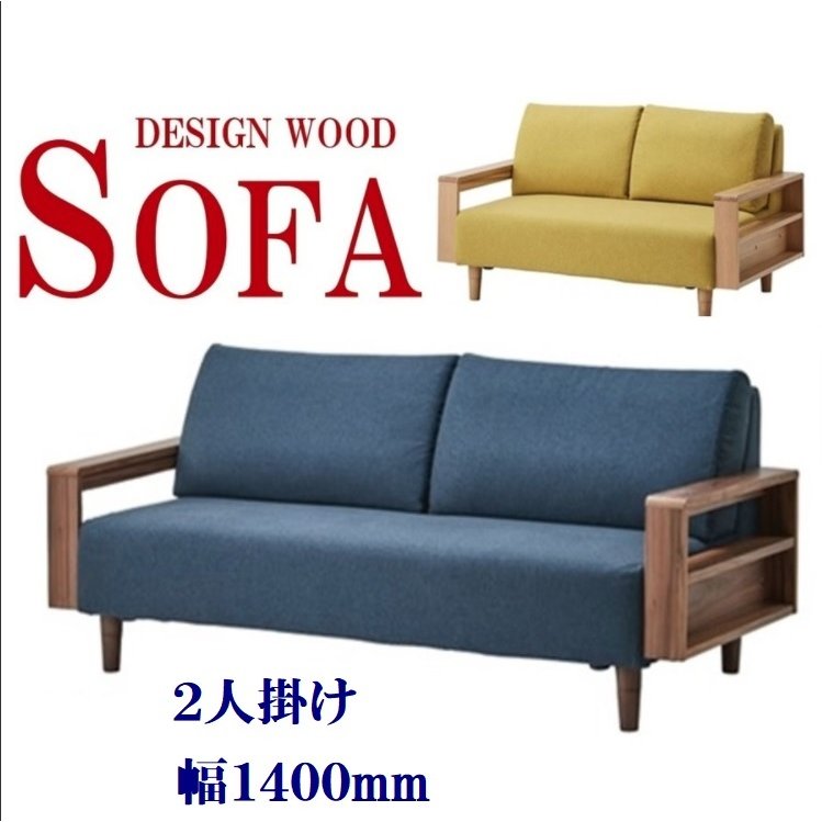 ■2人掛けソファ 木肘 2Pソファ デザインソファ スリム 幅1400 ロータイプ カバーリング 布 ファブリック 北欧 シンプル