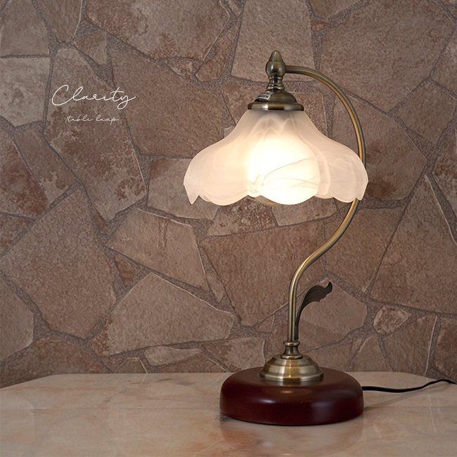 置照明 クラリティ テーブルランプ 1灯 テーブルライト ベッド 寝室 ベッドルーム ベッドサイド 枕元 書斎 デスク デスクライト リビング ダイニング レトロ 風 アンティーク 調 カフェ風 カフェ 喫茶店 レストラン 間接照明 上品な美しさのあるテーブルランプ。 ●お花をイメージしたランプなので、葉っぱがアクセントになっています。 ●シェードもお花の形で可愛いです。 ●土台は木製なので、高級感があります。 ●シンプルなデザインなので、北欧・モダン・韓国・ナチュラルなど様々なインテリアに馴染みます。 【生産国】中国 【サイズ(約)】W26×D26×H43cm 【重量(約)】1.5kg 【素材】ガラス、鉄、木材 【電球】E26/4W LED電球1個付属 【保証期間】1年間 【仕様】ON/OFFスイッチ 【PSE適合】日本の電気用品安全法(PSE)の技術基準に適合した電気用品です。 【PSマークの種類】特定電気用品以外の電気用品 【定格電圧】100V 【定格電流】0.6A