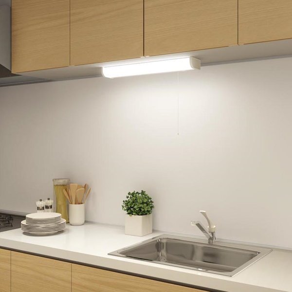 ■商品説明 キッチンの壁面にも、棚下にも、どちらでも取り付けできる兼用型のキッチンライト。 キッチンのレイアウトに合わせやすい構造です。 ■商品詳細 サイズ:巾547×高50×出107mm 重量:0.6kg 光源寿命:40000時間 定格光束:725lm 定格消費電力:9.2W Ra(演色性):83 色温度:6500(昼光色) 素材:ポリカーボネート(白色)、ポリカーボネート(乳白) 電球タイプ:LED一体型 取り付け方法:取り付け工事が必要となります。 その他:調光器不可、壁面・棚下面取付兼用 ※引き紐スイッチタイプ