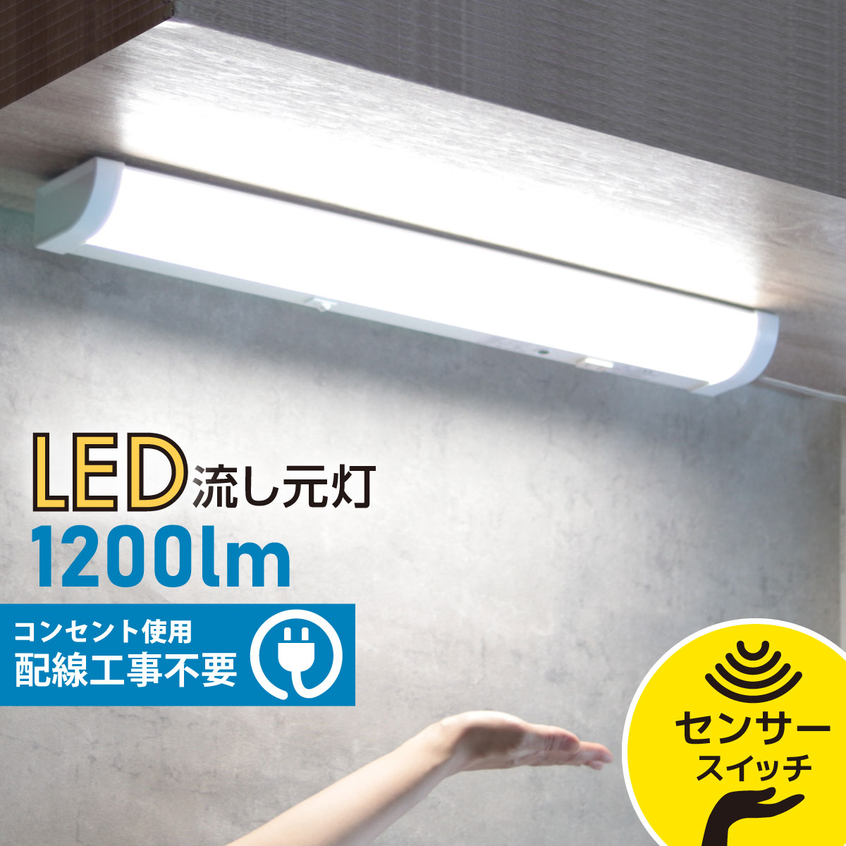 【 特 長 】 ● 手元をしっかりと照らす、センサースイッチタイプのLED流し元灯 ● 手を近づけるだけでON/OFF切替が可能、濡れた手でも、近づけるだけで点灯・消灯可能 ● 差込みプラグ付で配線工事不要、一般家庭のコンセントがそのまま使えます ● 棚下にも壁にも設置可能 ● 長寿命・省エネ型照明器具 ● サービスコンセント付き(1000Wまで、電源スイッチに連動しません)