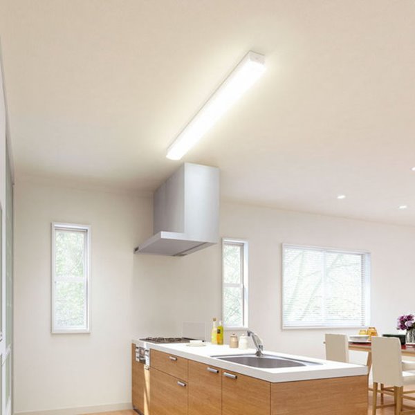 ■商品説明 40Wの蛍光灯、2本相当の明るさがあるキッチンベースライトです。 引掛けシーリングがあれば簡単に取り付け可能なクイックAタイプ。 ■商品詳細 サイズ:巾130×長さ1226×高さ99mm 重量:2.8kg 適用畳数:キッチン用の天井照明器具 光源寿命:40000時間 定格光束:4000lm 定格消費電力:27.8W Ra(演色性):83 色温度:5000K(昼白色) 素材:鋼(オフホワイト色) 電球タイプ:LED一体型 取り付け方法:クイックA(引掛けシーリングに対応)、化粧ネジ式 その他:調光器不可