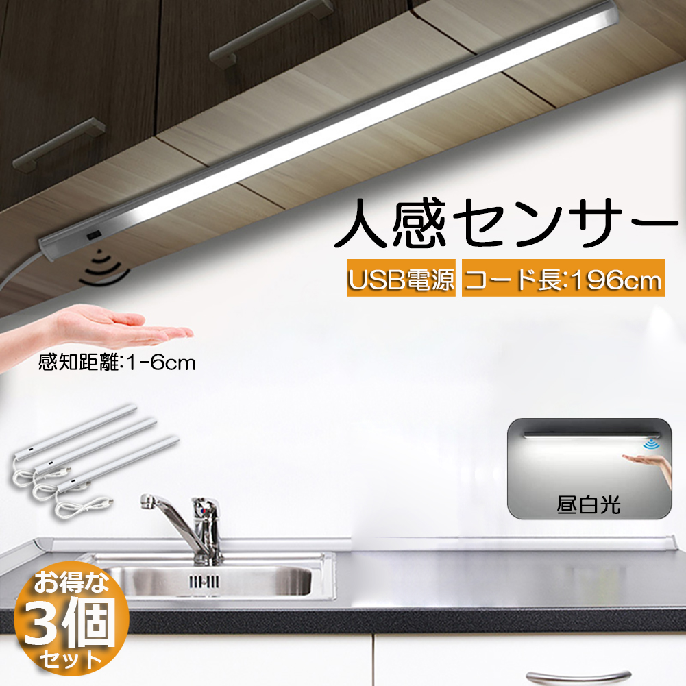 ■人感センサーライト キッチンライト フットライト 3個セット LEDバーライト センサーライト 40cm 昼白色 バーライト タッチレス センサー