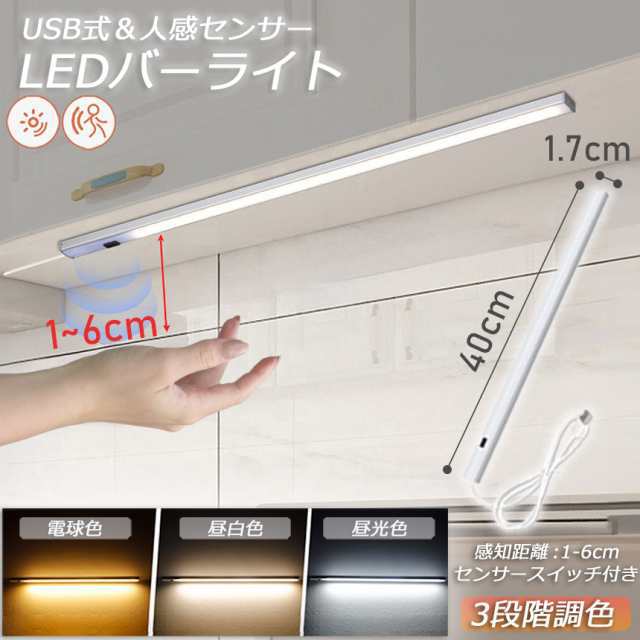 人感センサーライト キッチンライト フットライト LEDバーライト センサーライト 40cm 3段階調色 電球色 昼白色 昼光色 バーライト タッチレス センサーライト 非接触 USBケーブル付き 卓上LEDライト 無段階調光 手元灯 流し元灯 台所 棚下 間接照明 工事不要