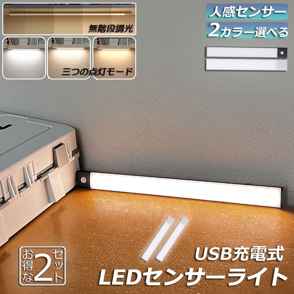 【3色設定可能 & 調光機能】3色: 電球色、昼白色、昼光色。いつもお好きな照明色を選択できます。【調光機能付き】 10%-100%の照明輝度を調整可能【大容量電池 & USB充電】350mah大容量のリチウムイオン電池を搭載しており、USBケーブルで充電でき、電池交換の面倒もないし、配線やコンセント接続の必要もありません。※注意:充電時にセンサーモードをオンにしないでください。充電中センサーモードを起動すると、センサーが壊れる恐れがあります。【高敏度内蔵センサーライト】最先端の高感度光センサーを搭載。120°左右3-5m以内の動体検知してライトが点灯し、約20秒後に動体が検知されない場合は自動に消灯します。注意:この製品はその感知機能を最適化しており、センサーは非常に敏感です。明るい場所では、(同じ場所にライト2本を設置する場合、一つのライトが点灯すると、環境が明るいためもう一つライトのセンサーが感応できなく点灯しないことになります。)誰かが検出範囲に入ってもライトは点灯しません。しかし、暗い場所では、3-5m以内に誰かや動