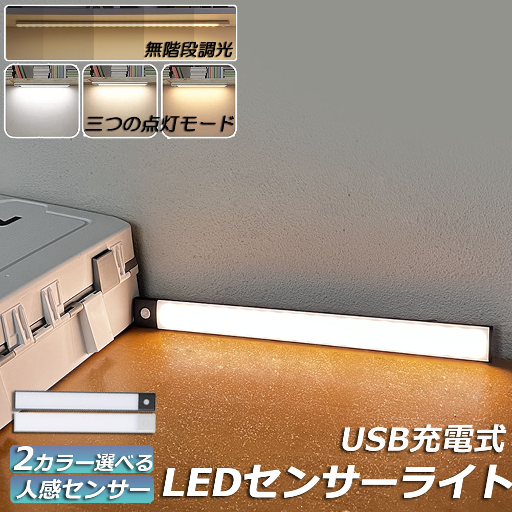 【3色設定可能 & 調光機能】3色: 電球色、昼白色、昼光色。いつもお好きな照明色を選択できます。【調光機能付き】 10%-100%の照明輝度を調整可能【大容量電池 & USB充電】350mah大容量のリチウムイオン電池を搭載しており、USBケーブルで充電でき、電池交換の面倒もないし、配線やコンセント接続の必要もありません。※注意:充電時にセンサーモードをオンにしないでください。充電中センサーモードを起動すると、センサーが壊れる恐れがあります。【高敏度内蔵センサーライト】最先端の高感度光センサーを搭載。120°左右3-5m以内の動体検知してライトが点灯し、約20秒後に動体が検知されない場合は自動に消灯します。注意:この製品はその感知機能を最適化しており、センサーは非常に敏感です。明るい場所では、(同じ場所にライト2本を設置する場合、一つのライトが点灯すると、環境が明るいためもう一つライトのセンサーが感応できなく点灯しないことになります。)誰かが検出範囲に入ってもライトは点灯しません。しかし、暗い場所では、3-5m以内に誰かや動物が動いている限