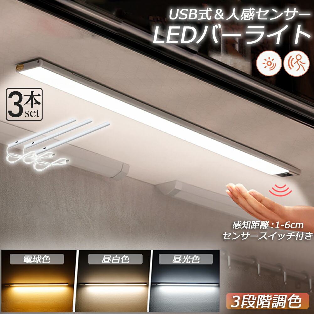 ■人感センサーライト キッチンライト フットライト LEDバーライト 3個セット センサーライト 40cm 3段階調色 電球色 昼白色 昼光色 バーラ