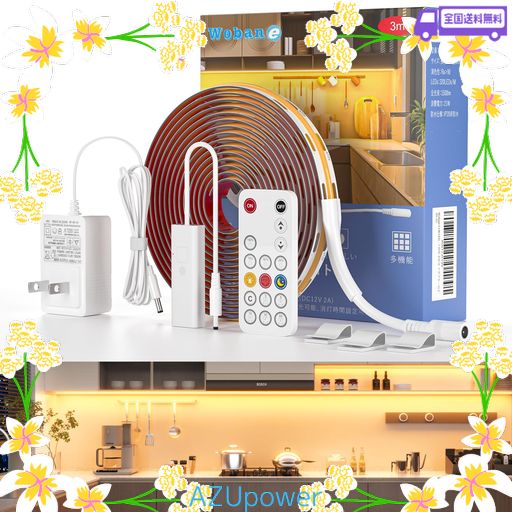■WOBANE COB LED テープライト 3M 電球色 1500LM 高輝度 間接照明 リモコン付 無段階調光 5段階消灯タイマー メモリ機能 工事不要 貼付け