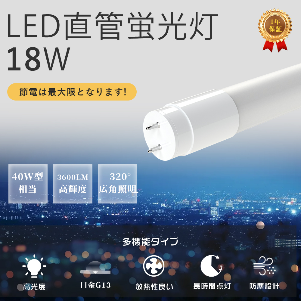 商品名:LED直管蛍光灯 40w形 T8 定格消費電力:18w 全光束:3600lm 口金:G13 入力電圧:AC85V-265V 50/60Hz 照射角度:320度 演色指数(CRI):Ra85+ 設計寿命:50000h 製品サイズ :φ25*1198mm 製品保証1年保証 材質:PC+アルミ基板