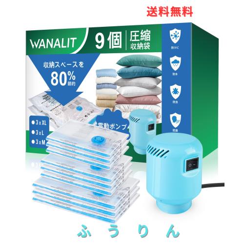 ■WANALIT 布団圧縮袋 9枚セット 電動ポンプ付き 【100×70cm×3枚/80×56cm×3枚/70×45cm×3枚】 布団/衣類/旅行用 防湿・防塵・防臭