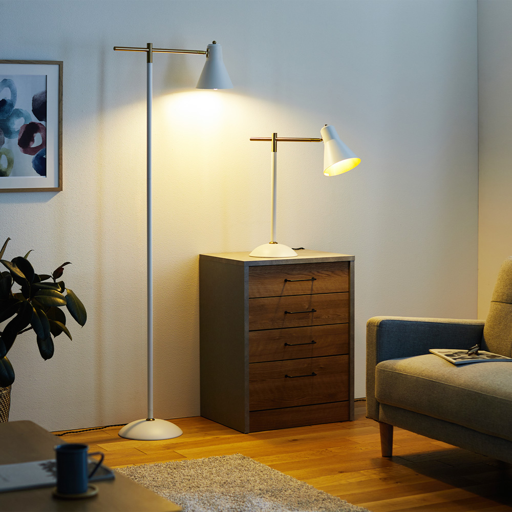 シンプルなフォルムに明かりを灯すと、シェード内側のゴールドカラーの存在感が際立ちますシェードは首元で上下調節ができ、明かりを灯す角度を変えられますLED電球付きで届いてすぐにお使いいただけます柔らかな光で包み込むテーブルライト手元を明るく照らす用途としてだけでなく、インテリアのアクセントにもなりますテーブルやデスク、窓際やベッドサイドなどどこにでも置きやすいサイズ感手元にてオン・オフができる手元スイッチ付き補助照明として使われるフロアライト置くだけで空間の印象が大きく変わり空間が引き締まりますフットスイッチ付きで、かがまずにライトのオンオフができます