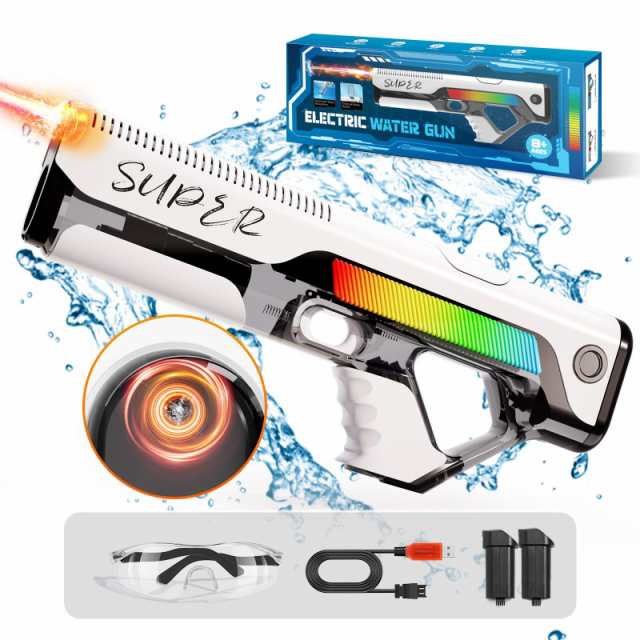 ■【2025新進化】電動ウォーターガン 光る 水鉄砲 電動 LEDライト & 自動給水 & ボトル外接可 電動水鉄砲 長距離 バッテリー2個 アウト