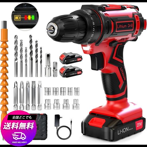■電動ドライバー 【新登場強化版 初心者】21V 電動ドリル インパクトドライバー 1500MAH バッテリー2個付き 25+1段階トルク調節 LEDライト