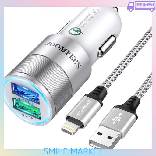■30W カーチャージャー JOOMFEEN 2ポート USBシガーソケット【QC3.0 & 2.4A/全金属/軽量/スマート識別/LEDライト】ライトニングケーブル付