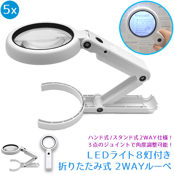 ハンド式/スタンド式2WAY仕様!さらに3点のジョイントで角度調整が可能なLEDライト8灯付き・折りたたみ式2WAYルーペ