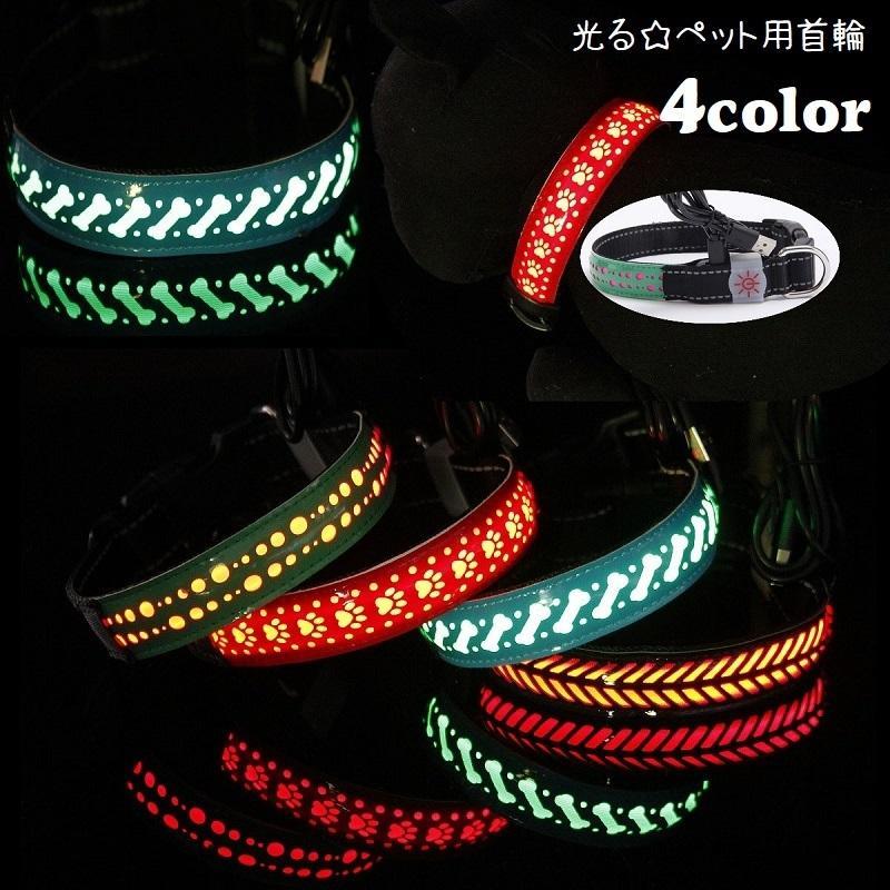 首輪 光る 犬 猫 ドッグ キャット 小型犬 中型犬 大型犬 ペット用品 ペットグッズ LEDライト 充電式 USBケーブル付き フェイクレザー 肉球