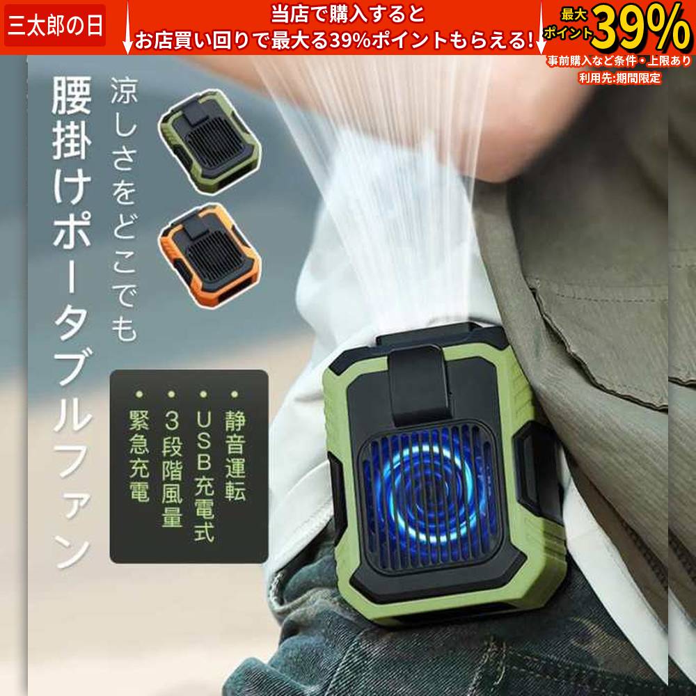 扇風機 ポータブル 腰掛けファン 腰掛け扇風機 USB充電式 3段階風量 LEDライト 緊急充電 ランタン 懐中電灯 高い効率 耐久性 防水防塵 耐衝撃 通勤 通学