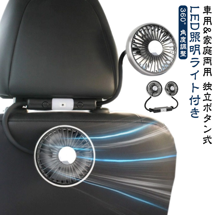 ■車載扇風機 車 後部座席 【独立ボタン式】 ファン 車載 扇風機 3階段風量 ツインファン LEDライト 360°角度調整 ヘッドレスト 強風力 強