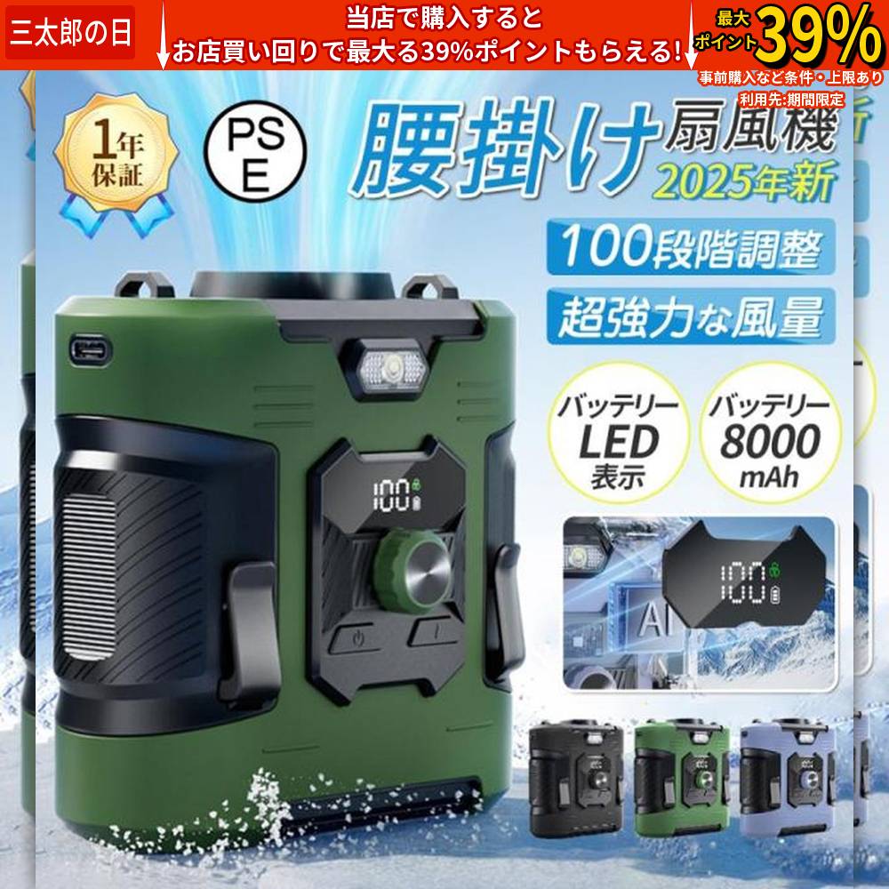 ■【2025新登場】【正規品】 扇風機 腰掛け扇風機 卓上 100段階風量調節 首掛け LEDライト 小型 8000mAh 携帯便利 大風量 静音 USB充電 Max