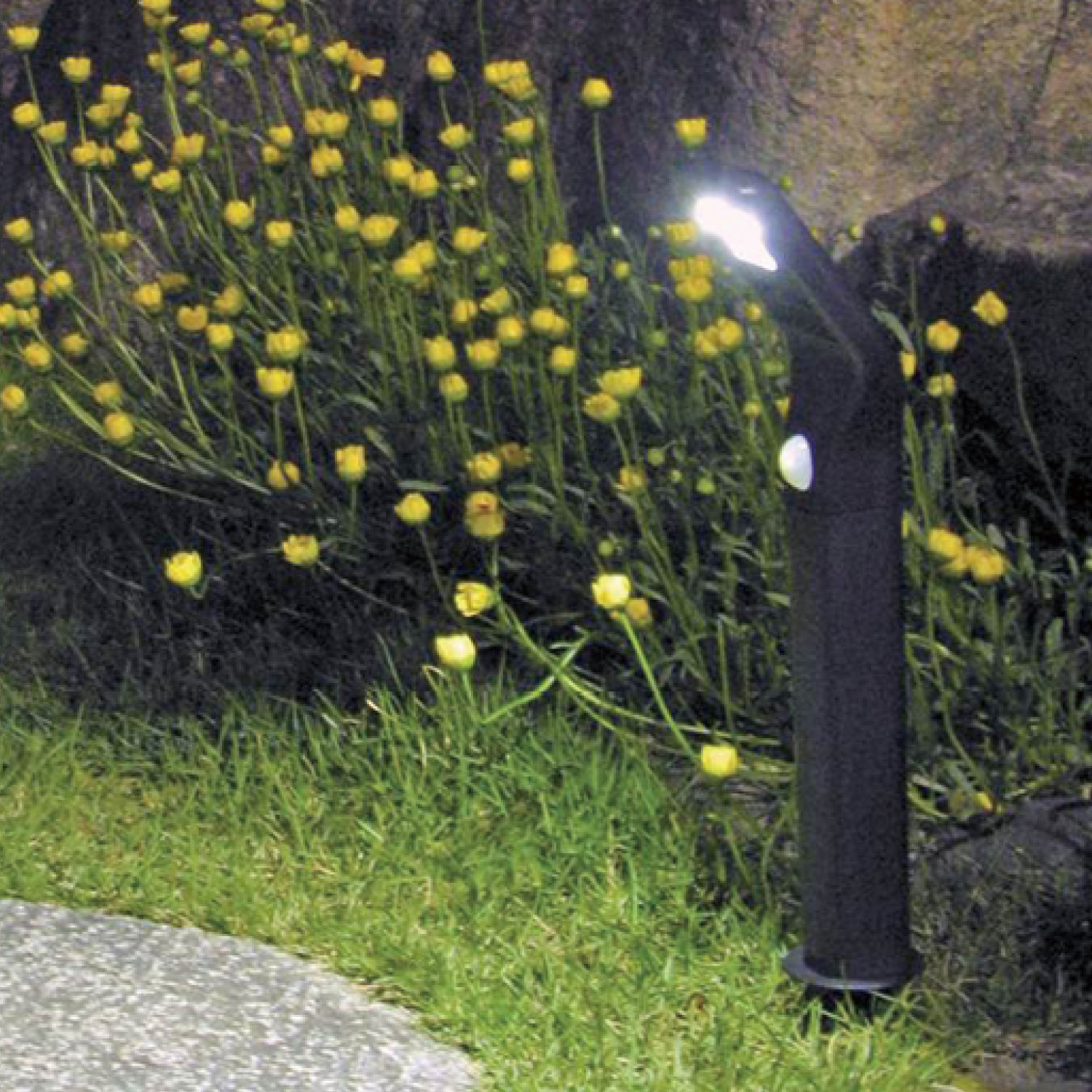 お庭や玄関アプローチなどの地面に差し込むだけで設置できる、スタンドタイプのLEDライト太陽光で充電できるので電源がないところでも設置でき、配線がないのですっきり美しい見た目をキープできます防犯としてだけでなく、動物の侵入対策にも暗くなって人が通ると自動で点灯する人感センサー付きで、フル点灯時は最大約100ルーメンの大光量を実現常時点灯だけでなく、フラッシュ機能も搭載していますソーラーパネルで昼間に充電でき、暗くなると点灯