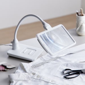 倍率は3倍で紙面を大きく捉えることができるワイドフレームのデスク型ルーペ。28灯の高輝度LEDライトが非常に明るく、ルーペとしてだけでなくスタンドライトとしても優秀。グースネック下部にあるダイヤルを回転させて明るさの調節が可能。対象物を均一に照らし眼精疲労を軽減します。LEDライトは高輝度SMDチップを使用しています。SMDは従来の球型LEDよりも小さく明るいのが特徴です。LEDライトを点灯させるにはパソコンなどのUSBポートから電源を取るか商品に付属されているUSB変換ACアダプターを使用し、室内などに設置のコンセントに差し込んで電源供給してください。LEDライト自体の耐久時間は約1万時間。両手が使えるので、読書や新聞はもちろん、手芸や塗り絵、趣味や仕事での細かい作業にも最適です。