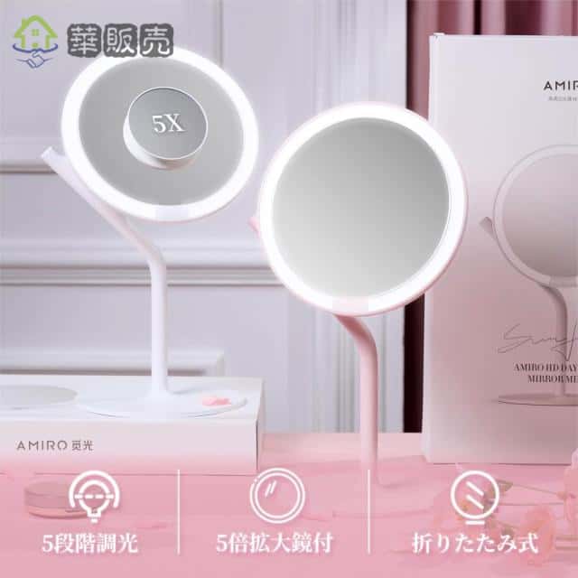 女優ミラー 卓上ミラー 化粧鏡 ミラー メイク 5倍拡大鏡付き 三色調光 LEDライト USB充電 メイクミラー ライト付き 折りたたみ 明るさ調節 タッチボタン 携帯型