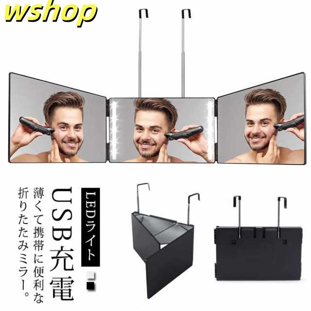 三面鏡 鏡 壁掛け 折りたたみ LEDライト USB充電 化粧鏡 HD鏡面 折りたたみミラー 化粧ミラー 大きめ 調整可 ギフト