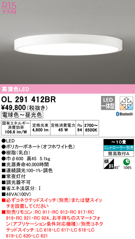 ■(送料無料) オーデリック OL291412BR シーリングライト LED一体型 電球色〜昼光色 Bluetooth対応 ODELIC