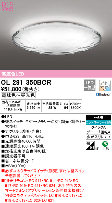 ■オーデリック OL291350BCR シーリングライト LED一体型 電球色〜昼光色 Bluetooth対応 ODELIC