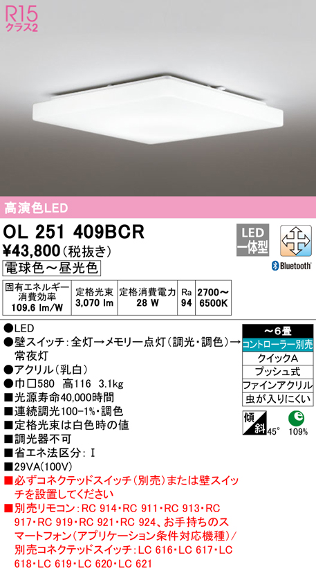 ■(送料無料) オーデリック OL251409BCR シーリングライト LED一体型 電球色〜昼光色 Bluetooth対応 ODELIC