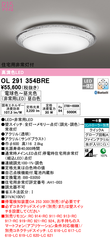 ◆メーカー:オーデリック ◆品名:シーリングライト LED一体型 電球色〜昼光色 Bluetooth対応 ◆品番:OL291354BRE ・商品スペックについては商品画像をご参照くださいませ。 ◆沖縄県は配送不可となります。ご了承下さい。 ※「発送先が北海道・沖縄・離島地域」に該当するお客様は別途送料がかかる場合がございます。 システムの都合上、ご注文時には送料が加算されておりませんが、 ご注文完了後に当店よりメールにて追加送料の承諾が取れてから手配を進めさせていただきます。 「発送先が北海道・沖縄・離島地域」に該当するお客様で ご注文前に送料を知りたい方はお問い合わせいただけましたらご案内いたしますので、 お気軽にお申し付けください。
