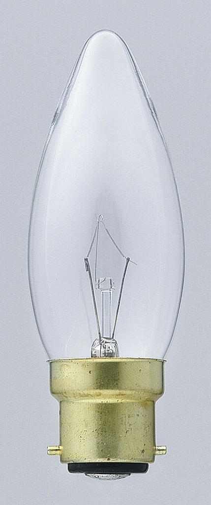 ●海外照明器具用(主にヨーロッパ)。●E14ベースはヨーロッパの照明器具に多く使われています。●ガラス球の形状がローソクの炎形の電球。シャンデリア器具にはもちろん、電球の形やフィラメントの輝きを見せるブラケット、ペンダントにも使用できます。■定格: ・電圧 100/110V ・消費電力 25W ・寿命:約1,500時間■本体サイズ: ・全長:100mm ・バルブ径:37mm ・口金:B22D■入数:1個■カラー:クリア