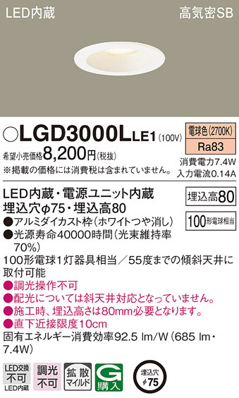 ■パナソニック LGD3000LLE1 ダウンライト100形拡散電球色 Panasonic