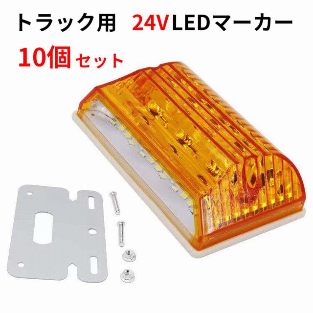 【商品説明】LEDならではの迫力満点の発光で外観を明るくイメージチェンジ!トラック、トレーラー、ダンプ等をステー一体型サイドマーカーで簡単にカスタマイズ出来ます。大容量10個入りですので、トラック全周囲装着に最適です。カラーレンズ部は透過率の高い素材を使用しています。【商品内容】ライト本体 10個(ステー一体型)【仕様】電源: DC24V用LED素子: 12SMD+8SMD【配線】黒:アース赤:ダウンライト白:側面発光(弱) 黄:側面発光(強) 【注意事項】※裏面の配線穴からも水が入る事がありますのでご注意ください。※結露などした場合はレンズを外して乾かしてください。※取り付けに慣れていない方は専門の業者にお任せください。※完全防水の商品ではございませんので、ご使用前にリング部?配線部にコーキング?ビニールテープなどで必ず防水処理をして下さい。※ステーにマーカーを取付る際、締め付けすぎるとサイドマーカー本体を破損させ、防水性能を低下させてしまいます。締め付け過ぎにはご注意してください。追加でコーキング処理をしていただくと、より長くご使用いただけます。※取扱説明書は付属しておりません。