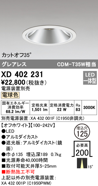 ◆メーカー:オーデリック ◆品名:ダウンライト LED一体型 電球色 M形(一般形) ◆品番:XD402231 ◆器具光束(lm):1000〜2000 ・商品スペックについては商品画像をご参照くださいませ。 ◆沖縄県は配送不可となります。ご了承下さい。 ※「発送先が北海道・沖縄・離島地域」に該当するお客様は別途送料がかかる場合がございます。 システムの都合上、ご注文時には送料が加算されておりませんが、 ご注文完了後に当店よりメールにて追加送料の承諾が取れてから手配を進めさせていただきます。 「発送先が北海道・沖縄・離島地域」に該当するお客様で ご注文前に送料を知りたい方はお問い合わせいただけましたらご案内いたしますので、 お気軽にお申し付けください。