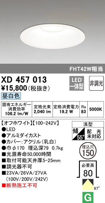 ■(送料無料) オーデリック XD457013 ダウンライト LED一体型 昼白色 非調光 M形(一般形) ODELIC