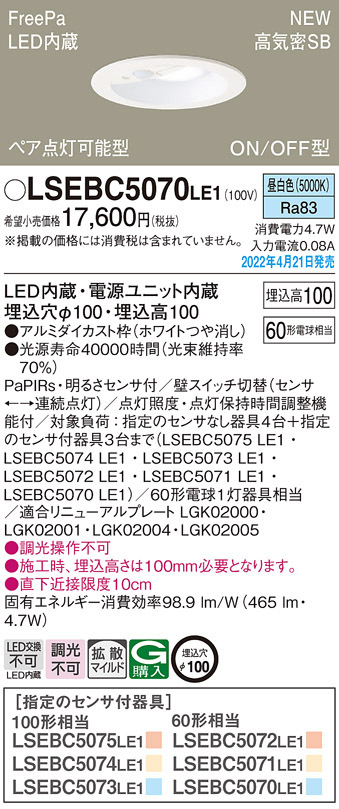 ■(送料無料) パナソニック LSEBC5070LE1 ダウンライト60形昼白色拡散 Panasonic