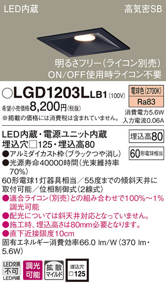 ■パナソニック LGD1203LLB1 ダウンライト60形拡散電球色 Panasonic