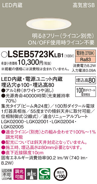 ■パナソニック LSEB5723KLB1 ダウンライト100形集光電球色 Panasonic