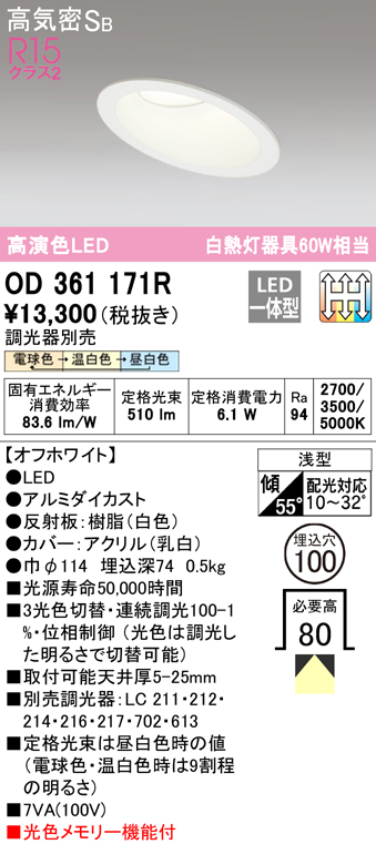 ■(送料無料) オーデリック OD361171R ダウンライト LED一体型 電球色/温白色/昼白色 3光色切替調光 高気密遮音SB形 ODELIC