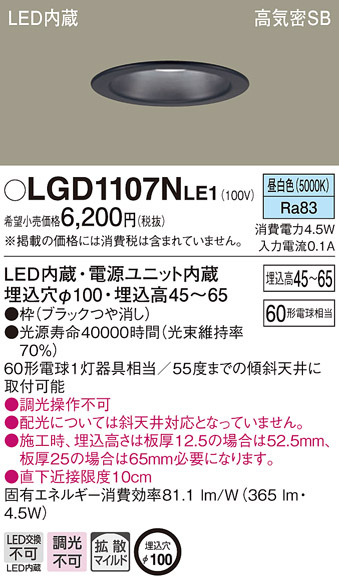 ■パナソニック LGD1107NLE1 ダウンライト60形拡散昼白色 Panasonic