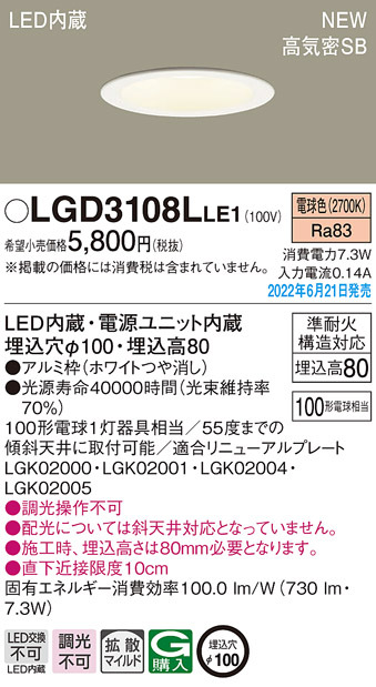 ■パナソニック LGD3108LLE1 ダウンライト100形電球色拡散 Panasonic